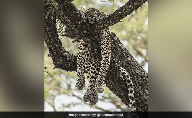 वायरल हो रही इस तस्वीर में आप देख सकते हैं कि एक तेंदुआ पेड़ की डाल पर सो रहा है. तेंदुए (Leopard) को इस कदर सोता देखकर साफ पता चल रहा है कि वो काफी थका हुआ है, तभी इस तरह से बेसुध हो सो रहा है. उसके चारे पंजे पेड़ से लटके हुए हैं और उसने अपने सिर को पेड़ पर टिका रखा है. पीछे के दो पंजों को उसे एक दूसरे में फंसा रखा है. ऐसी तस्वीर शायद ही आपने पहले कभी तेंदुए की देखी होगी.