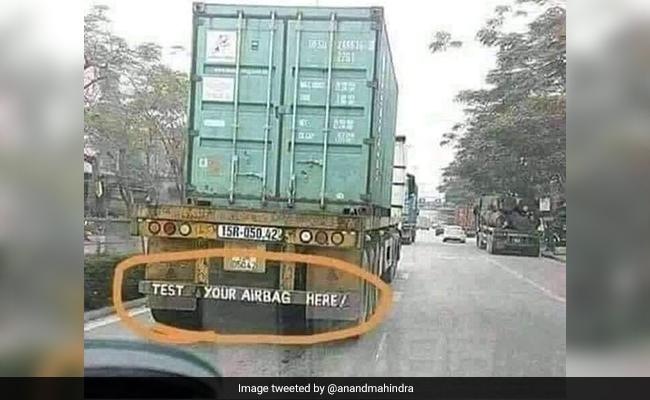 ट्रक के पिछले हिस्से पर लिखा हुआ टेक्स्ट था, "यहां टेस्ट करें अपना एयरबैग" (Test your airbag here). महिंद्रा ने इसे "शानदार" कहा है. उद्योगपति का ये ट्वीट अब सोशल मीडिया प्लेटफॉर्म पर जंगल की आग की तरह फैल गया है.