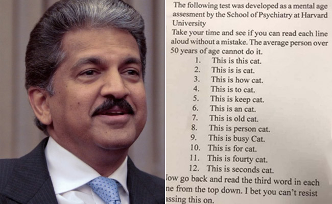 उद्योगपति आनंद महिंद्रा के इस टेस्ट को कोई भी ट्राई कर सकता है. अपनी मानसिक आयु का पता लगाने के लिए लोगों को इन सभी वाक्यों को एक साथ बिना किसी गलती के पढ़कर दिखाना है. बताया जा रहा है कि, टेस्ट हार्वर्ड विश्वविद्यालय में स्कूल ऑफ साइकियाट्री द्वारा मानसिक आयु मूल्यांकन के रूप में बनाया गया था. वहीं खुद बिजनेसमैन आनंद महिंद्रा भी इस टेस्ट से काफी प्रभावित हुए हैं. इस पोस्ट पर अब तक 24 हजार से ज्यादा लाइक्स आ चुके हैं. वहीं 2 हजार से ज्यादा लोगों ने इस पोस्ट को रिट्विट किया है.