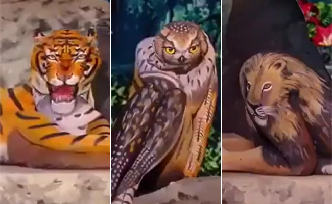 अक्सर कई कलाकार ऐसे होते हैं, जो बड़े-बड़े मंच पर अपनी प्रतिभा का लोहा मनवा रहे हैं. हाल ही में एक ऐसी ही कलाकारों का वीडियो सामने आया है, जिसमें कुछ लड़कियां शरीर पर कई पक्षियों और जानवरों की संरचना को ऐसे पेंट कर रखा है कि ये अलग-अलग पोज देने पर बिल्कुल असली प्रतीत होने लगते हैं. वीडियो में लड़कियां अपनी अनोखी प्रतिभा का सुंदर प्रदर्शन करते हुए स्टेज पर जंगल थीम में अलग-अलग जानवरों और पक्षियों का रूप लेती नजर आ रही हैं.