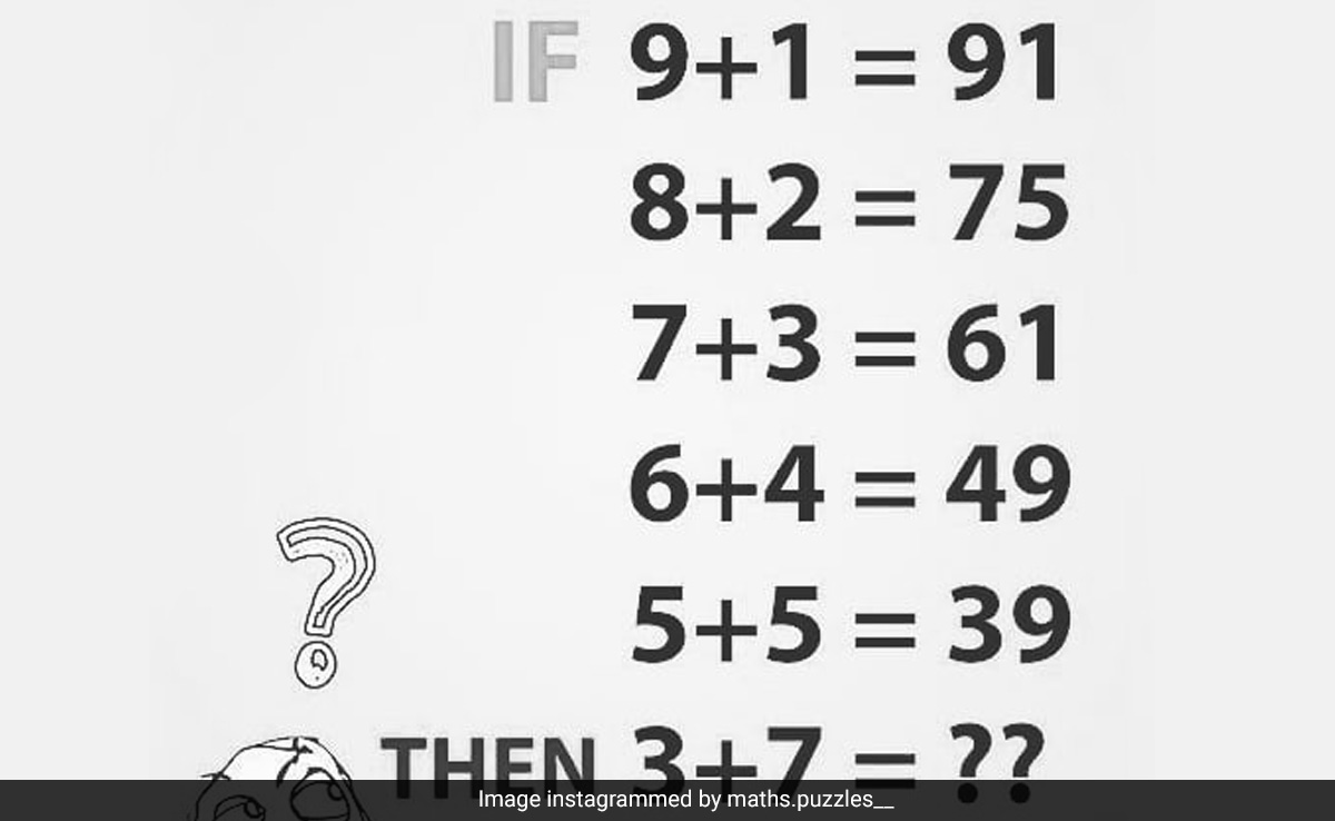 इस सवाल को इंस्टाग्राम पर @maths.puzzles__ हैंडल से शेयर किया गया था. यह पेज अक्सर गणित से संबंधित विभिन्न ब्रेन टीज़र शेयर करता है. इस विशेष प्रश्न में दिया गया है, "यदि 9+1= 91, 8+2 = 75, 7÷3 =61, 6+4 = 49, 5+5 = 39 तो 3+7= क्या है?" पोस्ट किए जाने के बाद से इसे कई लाइक्स और कमेंट्स मिल चुके हैं. कई लोगों ने कमेंट सेक्शन में अपने जवाब भी दिए हैं.