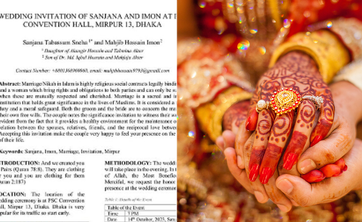 सोशल मीडिया पर वायरल हो रहा ये इनविटेशन कार्ड ढाका के संजना और इमोन के निकाह का निमंत्रण पत्र है. इसमें किसी रिसर्च पेपर की तरह डिजाइन किया गया गया है, जिसमें एब्स्ट्रेक्ट में निकाह का महत्व बताया गया है, तो इंट्रोडंक्शन दोनों की मुलाकात की कहानी. मेथेडोलॉजी में निकाह के रस्मों रिवाज के बारे में जानकारी दी गई है और कंक्लूजन में अपनी बात समाप्त की गई है. ये सभी मिलकर इस इनविटेशन कार्ड को कॉमिक अंदाज का बेजोड़ नमूना बनाने में सफल रहे हैं. अक्टूबर में हो चुके इस निकाह का इनविटेशन कार्ड अब लोगों का ध्यान खींच रहा है. ट्विटर पर rayyan definitely अकाउंट से शेयर किए गए शादी के इनविटेशन कार्ड की फोटो के कैप्शन पर लिखा है, अब तक विश्वास नहीं हो रहा है कि ये शादी का इनविटेशन कार्ड है.