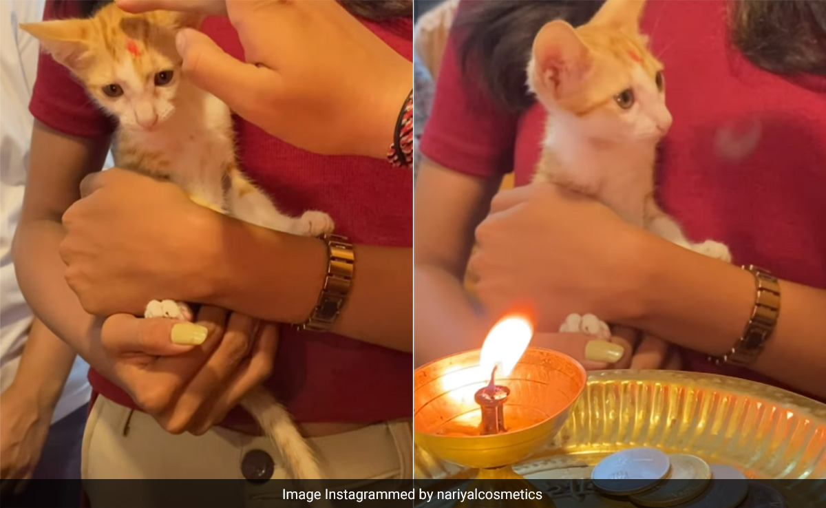 वीडियो में नारीयल कॉस्मेटिक्स के कर्मचारी सफेद और नारंगी रंग के पैच वाले बिल्ली के बच्चे की आरती करते नजर आ रहे हैं. उन्होंने इसके माथे पर तिलक भी लगाया और इसे गेंदे की पंखुड़ियों से नहलाया. समारोह के दौरान बिल्ली के बच्चे को आधिकारिक तौर पर कोकाया नाम दिया गया.