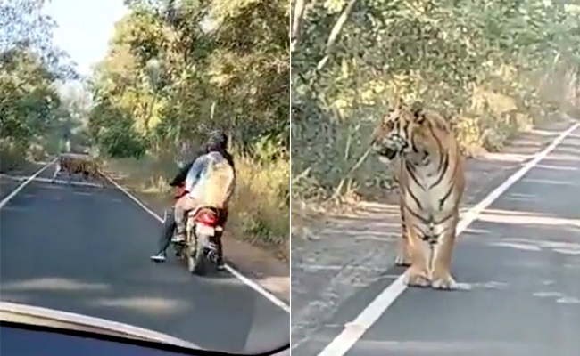 वीडियो में देखा जा सकता है कि, कैसे जंगल के बीच से गुजर रही सड़क पर अचानक एक बाघ आ जाता है, इस दौरान वहां एक कार सवारों के साथ-साथ बाइक सवार दो लोग बाघ के एक दम सामने आ जाते हैं, जिसे देखकर बाइक सवारों की डर के मारे सिट्टी-पिट्टी गुम हो जाती है. वीडियो में आगे जो होता है, उसे देखकर आपके भी रोंगटे खड़े हो जाएंगे.