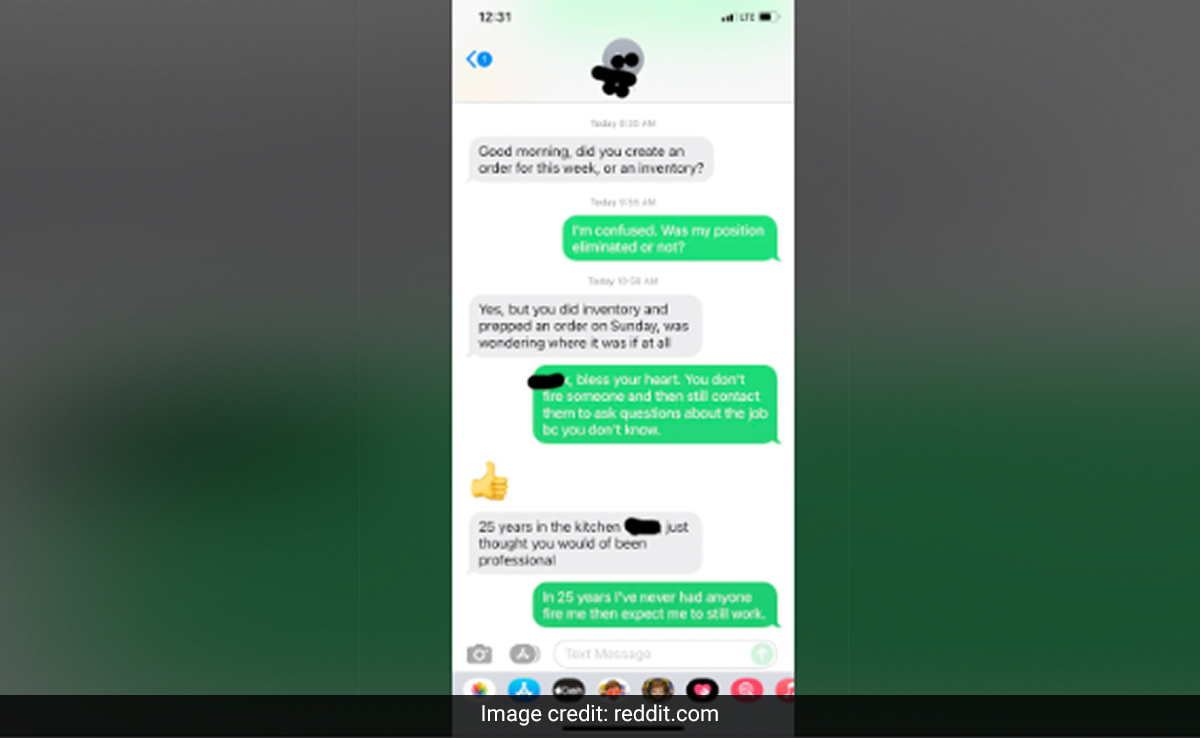 Reddit यूजर ScooterBobb ने अपनी बातचीत का स्क्रीनशॉट शेयर करते हुए लिखा, "मैं अभी भी सदमे में हूं." स्नैपशॉट में, आप पूर्व बॉस को शख्स से इन्वेंट्री पर अपडेट के बारे में पूछते हुए देख सकते हैं. इसके लिए, शख्स भ्रमित लगता है और अपने पूर्व बॉस से पूछता है कि क्या उसे निकाल दिया गया था या नहीं. बाद में, बॉस यह कहकर जवाब देता है, "हां अब आप कर्मचारी नहीं हैं, लेकिन आपने इन्वेंट्री की और रविवार को एक ऑर्डर तैयार किया था, जब आप कार्यरत थे. इसलिए सोचा कि आपसे पूछ लूं, कि उसपर अपडेट ले लूं आपसे." अंत में, वह शख्स पूर्व बॉस पर नाराज़ होता है और जवाब देता है." अपने आप से पूछो. पहले तो आप किसी को नौकरी से निकालते हैं और फिर उससे ही काम का अपडेट मांगते हैं. बॉस ने आगे लिखा- 25 साल आपने संस्थान में काम किया, मुझे लगा कि आप प्रोफेशनल होंगे. फिर शख्स ने जवाब दिया- लेकिन 25 साल में मैंने भी किसी को नौकरी से निकालते हुए नहीं देखा.