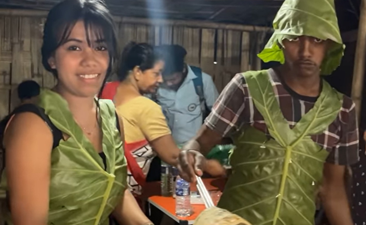 Sanna Sanna नाम के अकाउंट से इस वीडियो को शेयर किया गया है. वीडियो में एक लड़की और लड़का छोले कुलचे बनाते दिख रहे हैं. सड़क किनारे इस ढाबे पर बैठे कई लोग इस खाने का मजा लेते भी नजर आ रहे हैं, लेकिन उनके खाने से इनके बनाने का अंदाज अधिक मशहूर है. दोनों ने अपने शरीर पर पत्ते से बनी ड्रेस पहन रखी है. लड़की ने पत्ते की टॉप और स्कर्ट पहनी है, तो वहीं लड़के ने पत्ते से बना टीशर्ट पहन रखा है. वीडियो में एक बात और जो सभी ध्यान खींच रही है, वो है लड़के के देखने का तरीका. लड़का एकटक होकर कैमरे पर घूर रहा है.