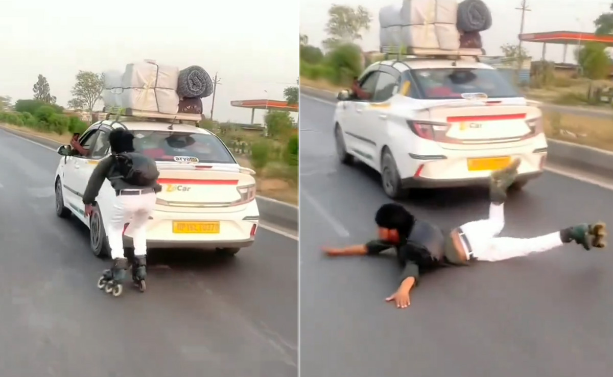 वीडियो की शुरुआत में एक लड़का स्केटिंग शूज पहने सड़क पर स्टंट मारता नजर आता है. वीडियो में आगे आप देखेंगे कि, लड़का सड़क पर उतरते ही फर्राटे भर रही कार का पीछा करने लगता है, लेकिन अगले ही पल उसका बैलेंस बिगड़ जाता है और उसकी सारी की सारी हीरोगिरी धड़ी की धड़ी रह जाती है. वीडियो में लड़का बैलेंस बिगड़ने के बाद लड़खड़ाकर सड़क पर गिर जाता है. वीडियो देखकर अंदाजा लगाया जा सकता है कि, इस हादसे में लड़के को भयंकर चोटें आई होंगी. दूसरी ओर बाइक पर बैठे उसके दोस्त इस दृश्य को कैमरे में कैद कर रहे थे. यह वीडियो उन लोगों के लिए भी एक सीख है, जो कभी भी खुली सड़क पर स्टंट दिखाना शुरू कर देते हैं.