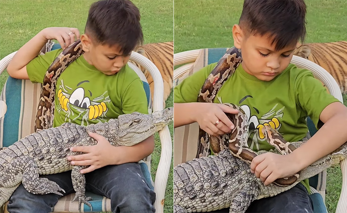 इंटरनेट पर जमकर वायरल हो रहे इस वीडियो को देखकर आप भी अपना माथा पकड़ लेंगे. वीडियो (Viral Video) में एक बच्चा मजे से एक कुर्सी पर बैठा नजर आ रहा है. इस दौरान उसकी गोद में एक बेबी मगरमच्छ और गले में एक अजगर लिपटा नजर आ रहा है. यही नहीं बच्चा जिस कुर्सी पर बैठा हुआ है उसके पीछे एक टाइगर बैठा हुआ है. बावजूद इसके बच्चा के चेहरे पर डर की एक सिकंज नजर नहीं आ रही है. वो उन जंगली जीवों के साथ इस कदर खेल रहा है, जैसे कि वो उसके पालतू हों.
