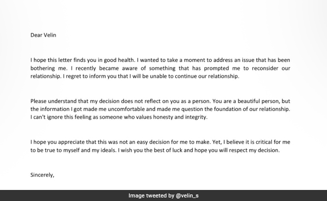 लेटर के एक हिस्से में लिखा है, "मुझे उम्मीद है कि यह पत्र आपको अच्छे स्वास्थ्य में मिलेगा. मैं उस मुद्दे को हल करने के लिए कुछ समय लेना चाहता हूं जो मुझे परेशान कर रहा है. मुझे हाल ही में कुछ ऐसा पता चला है जिसने मुझे हमारे रिश्ते पर पुनर्विचार करने के लिए प्रेरित किया है. मुझे आपको यह सूचित करते हुए खेद है कि मैं हमारे रिश्ते को जारी रखने में असमर्थ हूं."