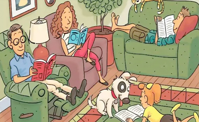 इस तस्वीर में आप आसानी से उत्तर ढूंढ सकते हैं. इस तस्वीर में दिख रहे लिविंग रूम में आपको कहीं न कहीं BooK, Novel, Story, Words, Page और Read लिखा हुआ साफ दिखाई दे जाएगा. बस इसके लिए आपको अपनी नजरों पर थोड़ा जोर देना है.
