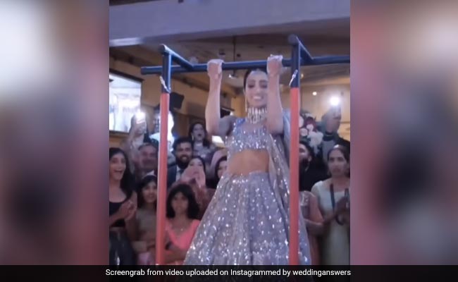 वीडियो में सिल्वर कलर के लहंगे में दिख रही ये खूबसूरत सी दुल्हन अपने अंदाज से लोगों का दिल जीत रही है. शायद ही आपने कभी ऐसी फिटनेस फ्रीक दुल्हन देखी होगी, जो डांस के साथ-साथ फिटनेस पर भी ध्यान देती नजर आ रही है. वायरल हो रहे इस वीडियो में देखा जा सकता है कि, कैसे यह दुल्हन पंजाबी गाने पर भांगड़ा करते हुए वर्कआउट कर रही है. भारी लहंगे में जबरदस्त एनर्जी के साथ कभी वो रॉड पर पुशअप करती दिखाई दे रही है, तो कभी दूल्हे को कम्पटीशन देते हुए उन्हें पीछे छोड़ रही है. दुल्हन के डांस और अंदाज को देखकर वहां मौजूद लोग तालियां पीटते हुए सीटियां बजा रहे हैं.