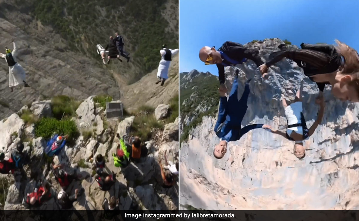 वायरल हो रहे वीडियो में, एक दूल्हा और दुल्हन, शादी में आए मेहमानों के साथ एक ऊंची चट्टान से स्काइडाइविंग करते हुए और मजेदार रोमांच का आनंद लेते हुए दिखाई दे रहे हैं. विशेष रूप से, प्रिसिला एंट और फिलिपो लेक्वेर्स के रूप में पहचाने जाने वाले कपल ने चट्टान के किनारे पर शादी की और फिर नई शुरुआत सेलिब्रेट करने के लिए रोमांचक छलांग लगाई. शादी में मौजूद सभी लोग उचित सुरक्षा उपकरणों से लैस थे.