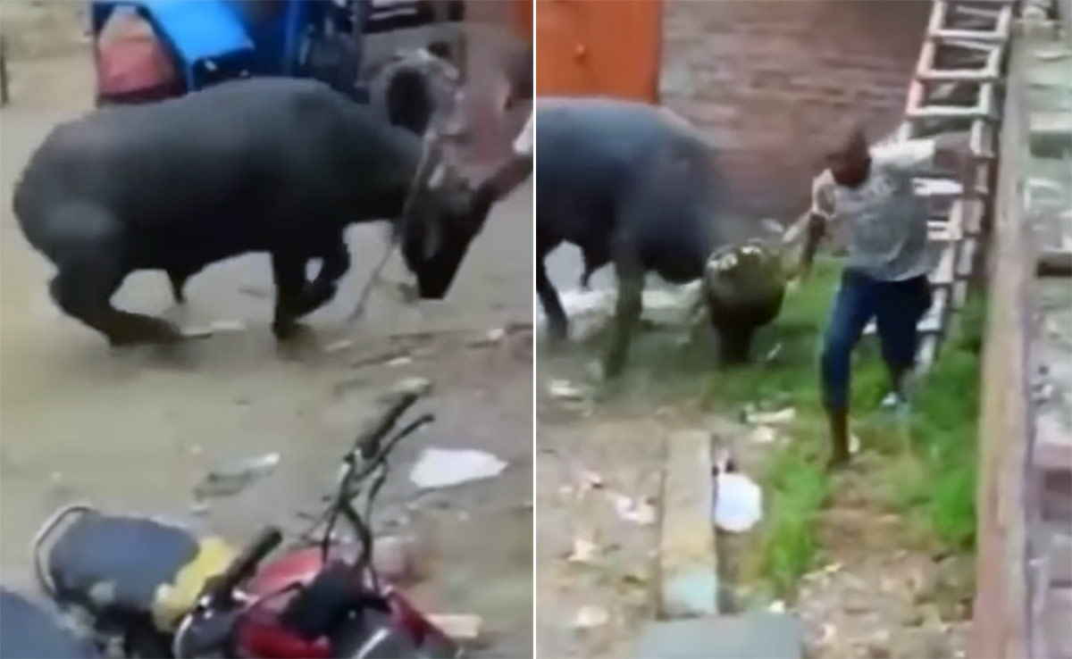कुछ जानवर जितने शांत दिखते हैं, गुस्सा आने पर उतने ही खूंखार हो जाते हैं. सोशल मीडिया पर यूं तो जानवरों से जुड़े एक से बढ़कर एक वीडियो सामने आते रहते हैं, जिनमें से कुछ दिल को छू जाते हैं, तो कुछ रोंगटे खड़े कर देते हैं. हाल ही में एक ऐसा ही वीडियो लोगों के होश उड़ा रहा है, जिसमें गुस्से से तिलमिलाई एक भैंस शख्स को दौड़ा दौड़ाकर उसकी हालत खराब करती नजर आ रही है.