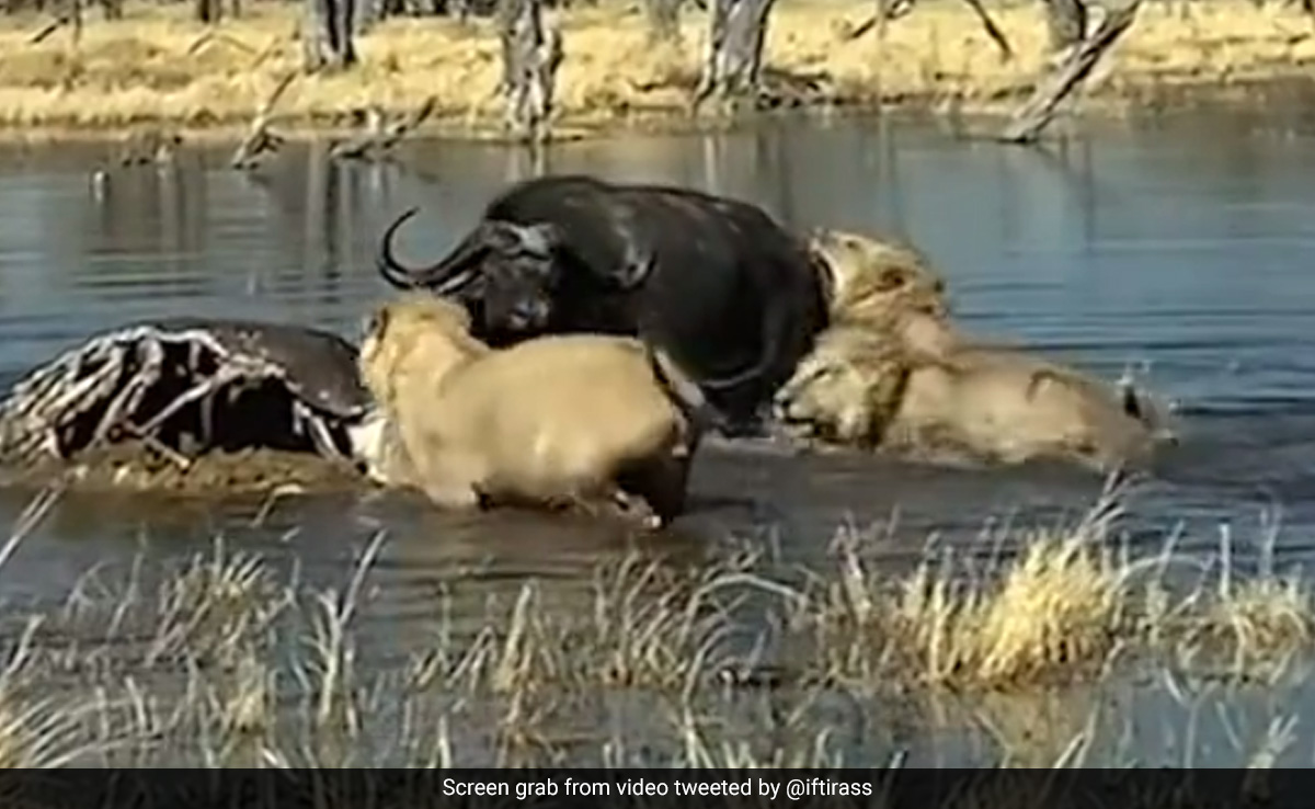 वीडियो में तीन बब्बर शेर पानी के अंदर एक भैंसे को अपने जाल में फंसाते नजर आ रहे हैं. इस दौरान अकेला भैंसा अपनी जान बचाने के लिए खूंखार शेरों से भिड़ता नजर आ रहा है. वीडियो में एक प्वाइंट पर ऐसा लगता है जैसे कि शेरों का झुंड अब भैंसे का शिकार कर लेंगे, लेकिन अगले ही पल बाजी पलट जाती है. पहले दो शेरों को भैंसा अकेले ही खदेड़ देता है, बाकी एक को सींग मारते हुए हवा में उछाल देता है. वीडियो के आखिर में शेर अपने रास्ते चलते बनते हैं और भैंसा इस जान की बाजी को जीत लेता है.