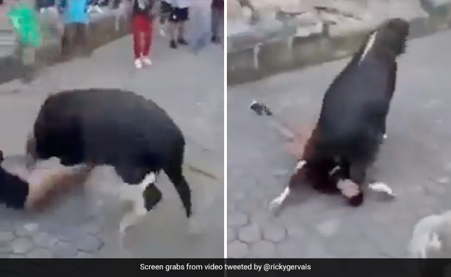 वायरल हो रहे इस वीडियो में आप देख सकते हैं कि कैसे एक शख्स भीड़ वाली जगह पर खड़ा है. उसके पास एक सांड भी खड़ा है. वो सांड के सींग को जैसे ही हाथ लगाता है. सांड सींग से ही शख्स पर इतना तेज वार करता है कि कोई भी ये देखकर डर जाएगा. वो सीधे शख्स के चेहरे पर अपने सींग से वार करता है और शख्स बुरी तरह से नीचे गिर जाता है. आगे आप देख सकते हैं कि सांड अपने चारों पैरों से शख्स को बुरी तरह रौंद देता है.