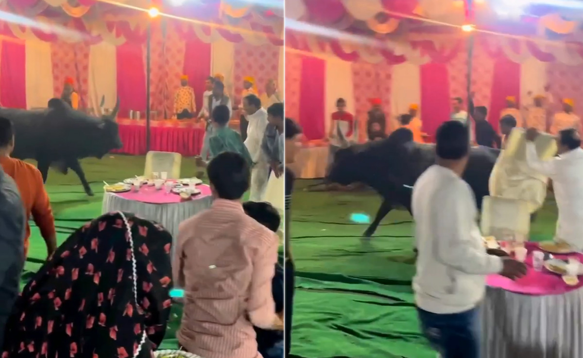 Angry Bull Enters The Wedding: शादी-ब्याह के मौकों पर कई बार जाने-अनजाने ऐसे नजारे देखने को मिल जाते हैं, जिनकी कल्पना भी नहीं की जा सकती. कभी फूफा का गुस्सा, तो कभी दूल्हा-दुल्हन की ग्रैंड एंट्री ध्यान खींच ही लेती है, तो कभी डीजे की धुन पर नागिन डांस करते घाराती-बाराती महफिल लूट लेते हैं. ऐसे ढेरों वीडियो आये दिन इंटरनेट पर वायरल होते ही रहते हैं, लेकिन कई बार शादी (Wedding Video) समारोह से जुड़े कुछ ऐसे वीडियो सामने आ जाते हैं, जिन्हें देखकर हंसी छूट जाती है और जिन्हें लोग बार-बार लूप में देखने को मजबूर हो जाते हैं. ऐसा ही एक वीडियो सोशल मीडिया पर देखने को मिल रहा है, जिसमें शादी समारोह में एक गुस्सैल सांड घुसा चला आता है और हंगामा मचा देता है.