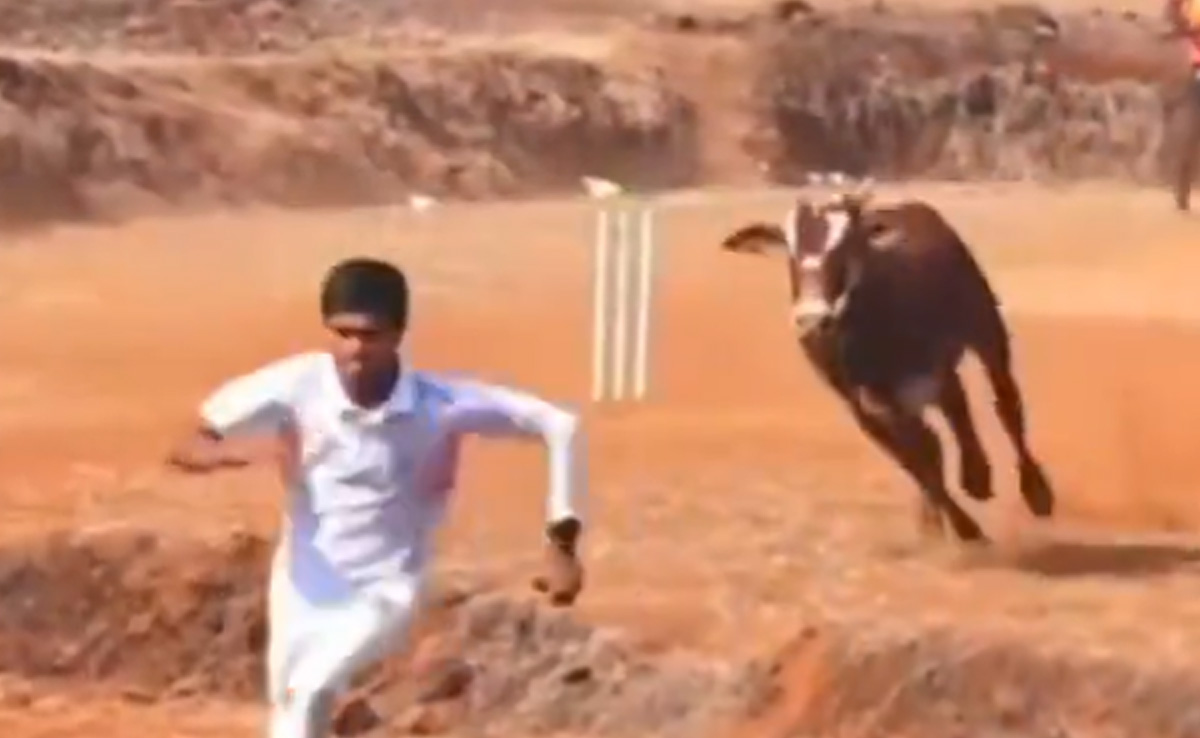 वीडियो देखकर अंदाजा लगाया जा सकता है कि, किसी गांव में क्रिकेट (cricket) मैच खेला जा रहा है, जहां अचानक से एक सांड विकेटों की ओर आ जाता है. इस दौरान सबसे पहले सांड विकेटकीपर की ओर जाता है, जिसे देखकर विकेटकीपर भागने लगता है. इसी बीच बल्लेबाज अपना बल्ला दिखाकर सांड को भगाने की कोशिश करने लगता है. बल्लेबाज की इस हरकत पर सांड गुस्से से तिलमिला उठता है और बल्लेबाज को खदेड़ने लगता है. देखा जा सकता है कि, किसी तरह बल्लेबाज वहां से भाग खड़ा होता है, तभी सांड तेजी से दौड़ते हुए अचानक अंपायर और गेंदबाज की ओर घूम जाता है, फिर क्या था बाकी सभी की तरह वो दोनों भी तेजी से मैदान छोड़कर भागते नजर आते हैं. यही वजह है कि, मैदान में हुरदंग मचाते सांड की वजह से मैच को रोकना पड़ जाता है.