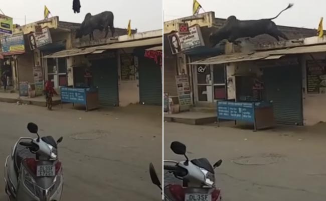 हैरान कर देने वाले इस वीडियो में देखा जा सकता है कि, एक काले रंग का सांड एक घर की छत पर चढ़ा हुआ है. वीडियो में आगे आप देख सकते हैं कि, कैसे बाहर निकलने की जगह नहीं मिलने पर गुस्से से तिलमिलाया सांड वहीं से बीच सड़क पर छलांग लगा देता है. सांड के इस तरह छलांग लगाने पर वहां मौजूद लोग अपनी जान बचाते नजर आते हैं. यह वीडियो इंटरनेट पर तेजी से वायरल हो रहा है, जिसे देखकर लोगों के होश उड़ रहे हैं. वीडियो में लोग सांड के हमले से खुद को बचाते हुए नजर आ रहे हैं.