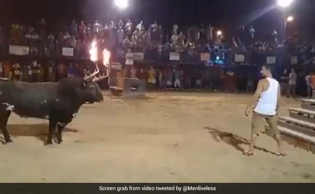 वायरल हो रहे इस वीडियो में आप देख सकते हैं कि एक शख्स भीड़ वाली जगह पर खड़ा है. उसके पास एक सांड भी खड़ा है. सांड की सींग में आग जल रही है और सामने खड़ा शख्स उसे सीढ़ियों वाला स्टंट करवाने की कोशिश कर रहा है. लेकिन, सांड को अचानक गुस्सा आया और वो तेजी में शख्स की ओर दौड़ा और अपने सींग से उसे उठाकर पहले तो सीढ़ियों के ऊपर ले गया और फिर सांड ने शख्स को बुरी तरह से नीचे की ओर पटक दिया. आप देख सकते हैं कि कैसे बुरी तरह से शख्स नीचे गिरता है. देखकर साफ पता चल रहा है कि उसकी हड्डियां तो बुरी तरह से टूटी होंगी.