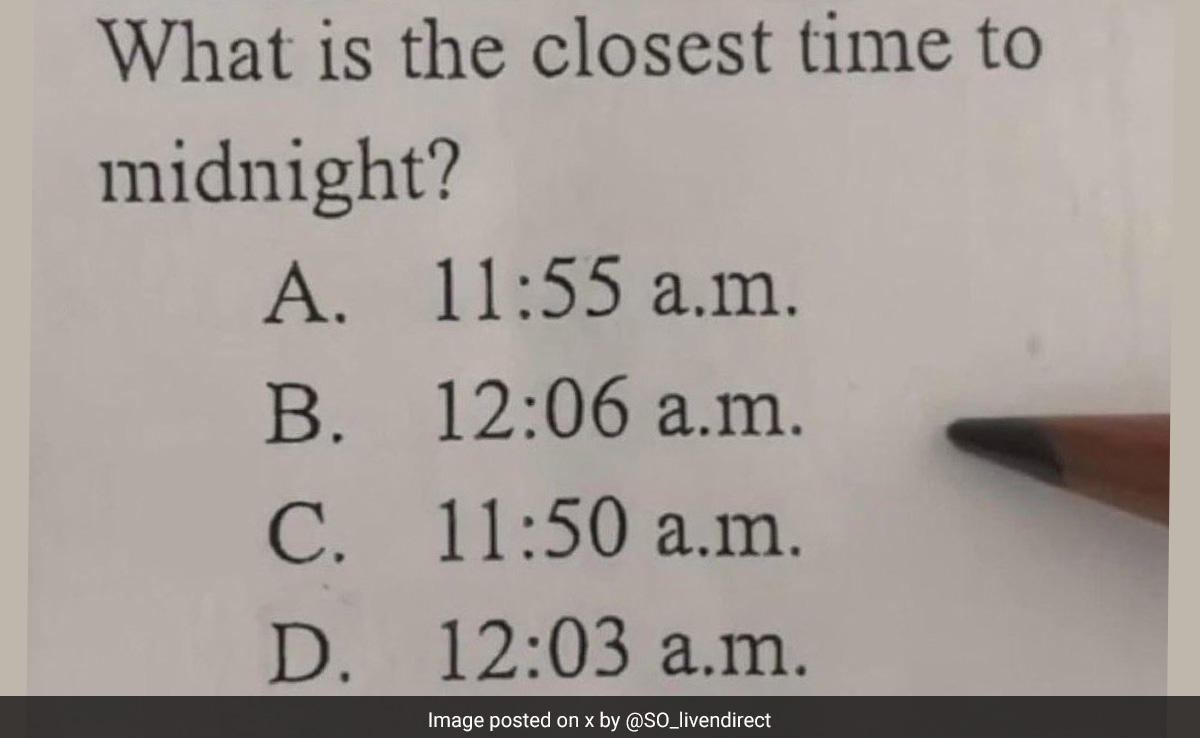 सोशल मीडिया प्लेटफॉर्म एक्स (ट्विटर) पर S.O नाम के यूजर ने एक मैथ्स के सवाल का फोटो पोस्ट किया है, जिसमें पूछा गया है कि. 'आधी रात का निकटतम समय क्या है? (What is the closest time to midnight?).
