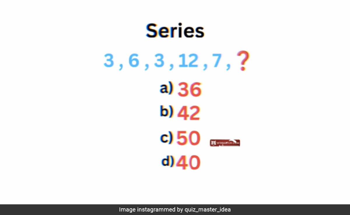 इंस्टाग्राम हैंडल @quiz_master_idea पर शेयर किए गए ब्रेन टीज़र के कैप्शन में लिखा है, “99% फेल हो जायेंगे? क्या आप इसको हल कर सकते हैं?" ब्रेन टीज़र में चार उत्तर विकल्पों के साथ संख्याओं की एक श्रृंखला शामिल है. आपका लक्ष्य अनुक्रम में अगली संख्या निकालना है. क्रम इस प्रकार है: "3, 6, 3, 12, 7,?". विकल्प हैं: ए) 36, बी) 42, सी) 50, और डी) 40. क्या आप इस गणित समस्या को हल कर सकते हैं? आपका समय अब शुरू होता है...
