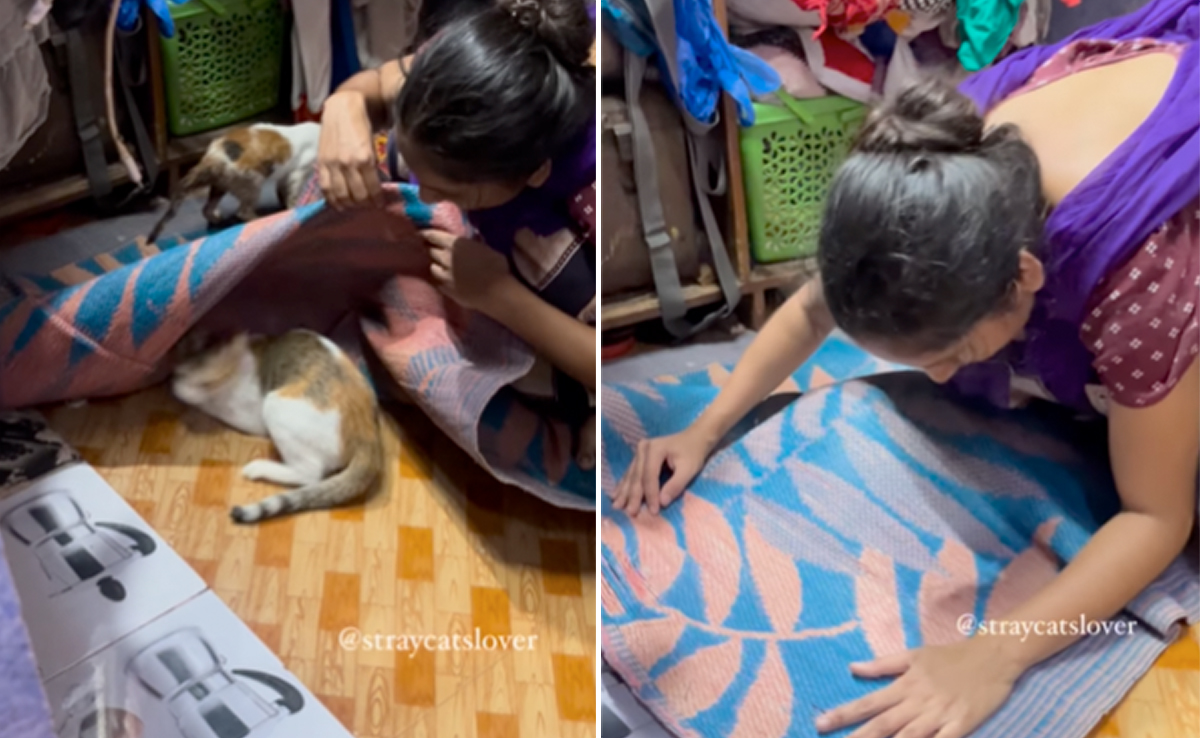 वीडियो को इंस्टाग्राम पेज @straycatslover पर शेयर किया गया था. क्लिप शुरु होती है और एक बिल्ली चटाई के नीचे छुपी हुई दिखाई देती है. जैसे ही महिला की नज़र उस पर पड़ती है, वह बिल्ली को पकड़ने और उसे चटाई से हटाने की कोशिश करती है. पूरे वीडियो में महिला को बिल्ली के साथ खेलते और उससे पूछते हुए देखा जा सकता है कि क्या उसे खेल में मजा आ रहा है. जब महिला बिल्ली को दिखाने के लिए चटाई हटाती है तो वह तुरंत इधर-उधर कूदने लगती है.