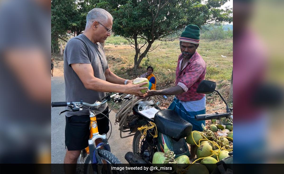 ट्विटर यूजर आरके मिश्रा ने विक्रेता से नारियल खरीदते हुए अपनी एक तस्वीर शेयर की है. जहां मोटरसाइकिल पर नारियल का गुच्छा लटका हुआ है, वहीं सीट के पीछे एक क्यूआर कोड दिखाई दे रहा है. मिश्रा अपनी साइकिल के साथ खड़े दिख रहे हैं और बैकग्राउंड में एक महिला लेन-देन देख रही है.