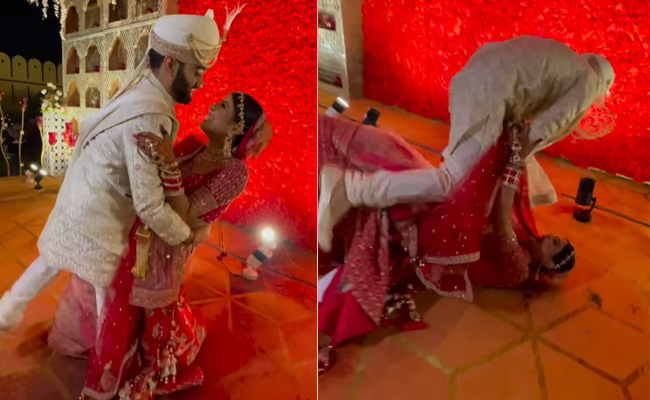 तेज से वायरल हो रहे इस वीडियो में एक कपल शादी के दौरान वेडिंग फोटो शूट कराता नजर आ रहा है. वीडियो को देखकर अंदाजा लगाया जा सकता है कि, फिल्मों की तरह दूल्हा-दुल्हन को स्टेज पर डांस करते हुए एक रोमांटिक पोज बनाना था. इसके लिए दुल्हन को कमर से पकड़ कर रखना था, लेकिन एक-दूसरे में खोये दूल्हा और दुल्हन शायद कुछ रूल भूल जाते हैं, जिसका अंजाम उन्हें अगले ही पल भुगतना पड़ जाता है. वीडियो में देखा जा सकता है कि, कैसे आखिर फ्रेम में दुल्हन दूल्हे के हाथ से छूट जाती है, जिसके चलते वो फ्लोर पर गिर जाती है.
