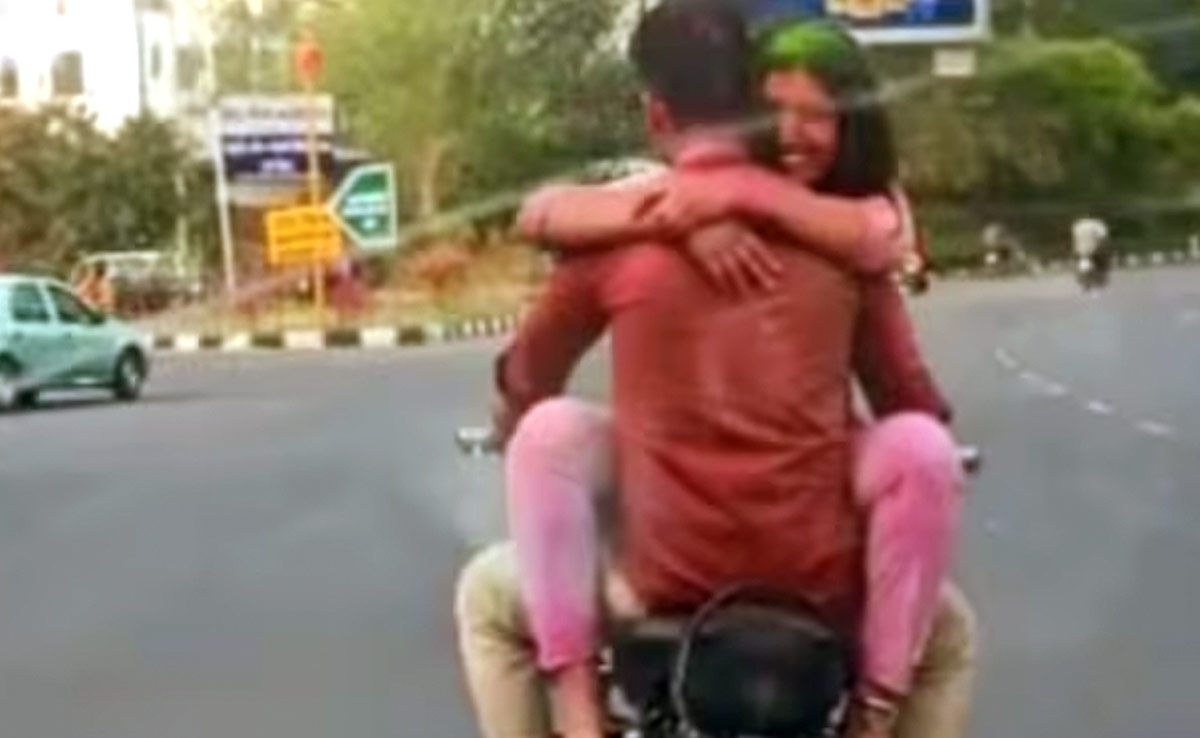 एक और होली के मौके पर जहां लोग एक-दूसरे को रंग-गुलाल लगाने में व्यस्त रहे. वहीं दूसरी ओर एक रोमांटिक कपल बाइक पर सवार होकर शहर के रास्ते एक करते नजर आया. वीडियो में देखा जा सकता है कि, कैसे सड़क पर दौड़ती एक बाइक पर सवार कपल खुले आम एक-दूजे की मोहब्बत में डूबे जा रहे थे. वीडियो में युवती बाइक की टंकी पर बैठकर अपने प्रेमी को गले लगाए हुए है और प्रेमी भी दुनिया को भूलकर मजे से मोहब्बत में खोकर गाड़ी भगाता नजर आ रहा है. इस दौरान राह चलते लोगों ने मोबाइल से इनका वीडियो शूट कर लिया, जो देखते ही देखते इंटरनेट पर तेजी से वायरल हो रहा है.
