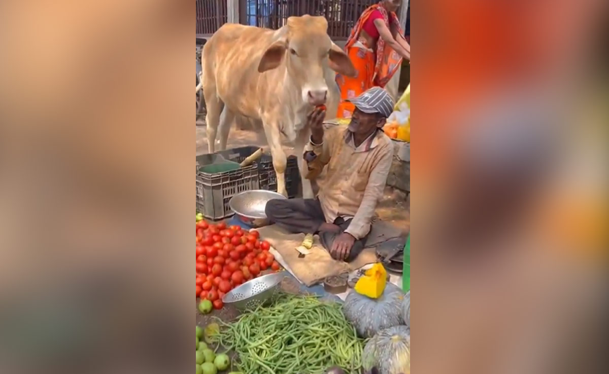 वायरल वीडियो में आप देख सकते हैं कि सब्जी बेचने वाले भैया जमीन पर बैठकर सब्जी बेच रहे हैं. वो सब्जी तौल रहे हैं और वहीं पीछे की ओर एक गाय खड़ी है जो उनके ऊपर जमकर प्यार लुटा रही है. कभी वो सब्जियों की ओर देख रही है तो कभी उस शख्स को दुलार कर रही है. आप देख सकते हैं कि कैसे गाय, सब्जी वाले भैया के गले से चिपककर उन्हें दुलार कर रही है. सब्जी विक्रेता बीच-बीच में उसे सब्जियां खिला रहे हैं. गाय खुद से उठाकर कोई सब्जी नहीं खाती है. बल्कि वो इंतज़ार कर रही है सब्जी विक्रेता कब उसे सब्जी खिलाएगा. कुछ देर के बाद सब्जी बेच रहा शख्स अपनी जेब से बिस्किट निकाल कर गाय को खिलाने लगता है. गाय खाती जाती है और साथ ही शख्स को पुचकारती भी जा रही है.