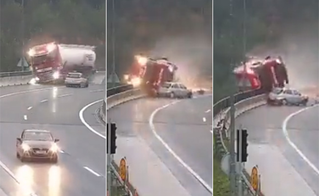वीडियो में देखा जा सकता है कि, कार (Car) की टक्कर की वजह से ट्रक फिसलता हुआ पुल के किनारे पर पहुंचकर पलटते हुए, पुल से नीचे गिर जाता है. सोशल मीडिया प्लेटफॉर्म ट्विटर (Twitter) पर इस वीडियो को शेयर किया गया है. इस वीडियो को देख लोग हैरान भी हैं और सीख भी ले रहे हैं.