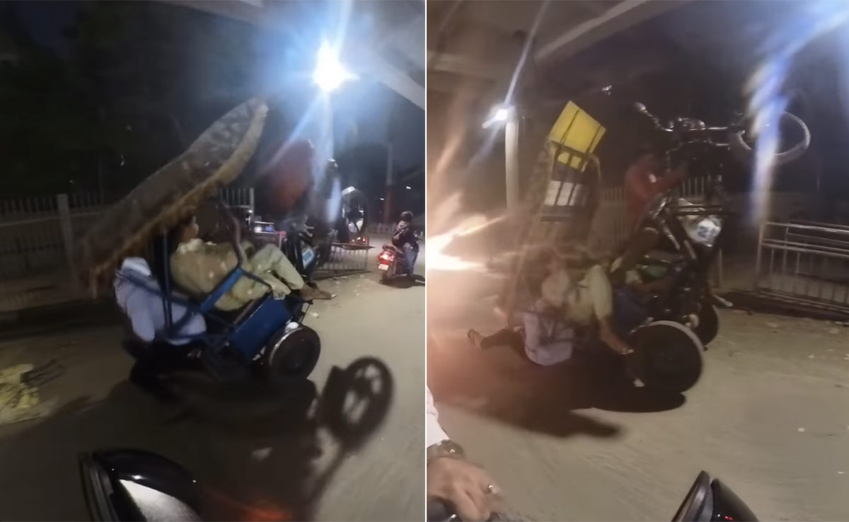 हुसैन द राइडर नाम के इंस्टा हैंडल ने ये वीडियो शेयर किया है, जिसमें दूर एक ऑटो नजर आता है. इस ऑटो में पीछे की तरफ दो लोग बैठे हैं और आगे की तरफ दो सवारी हैं. सामने ड्राइवर दिखाई देता है. ऑटो चलना शुरू करता है और अचानक उसके टायर जमीन छोड़ कर ऊपर जाने लगते हैं. एक पल को लगता है कि, ऑटो उड़ने वाला है, लेकिन वो पीछे की ओर पलट रहा होता है. इसे यूजर ने कैप्शन दिया है, 'हैवी ड्राइवर' जिसके जवाब में यूजर कमेंट कर रहे हैं कि, 'हैवी सवारी सही कैप्शन है.'