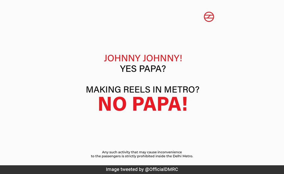 दिल्ली मेट्रो अथॉरिटी ने ट्वीट कर लोगों को सावधान करने के लिए नर्सरी की एक राइम का सहारा लिया है. दिल्ली मेट्रो रेल कॉर्पोरेशन ने ट्वीट करते हुए लिखा, जॉनी-जॉनी यश पापा, मेकिंग रील्स इन मेट्रो, नो पापा!. वहीं कैप्शन में लिखा है, ओपेन योर कैमरा, ना..ना..ना. ट्वीट में ये भी लिखा गया कि, ऐसी कोई भी गतिविधि जिससे यात्रियों को असुविधा हो, दंडनीय कार्रवाई के दायरे में आती है. दिल्ली मेट्रो के इस ट्वीट को शेयर करने के बाद से इसे 14 हजार से अधिक लोग देख चुके हैं.