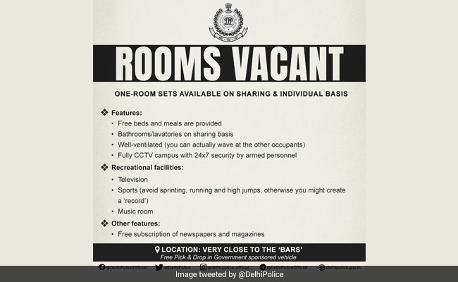 दिल्ली पुलिस (Delhi Police) ने बुधवार को एक मजेदार ट्वीट (Funny Tweet) पोस्ट किया, जो इंटरनेट पर तेजी से वायरल हो गया. पुलिस ने कमरा खाली है' (Rooms Vacant) शीर्षक से एक पैम्फलेट ट्वीट किया. इस पोस्ट में दिल्ली पुलिस ने जेल के कमरों के बारे में बताया है. पोस्ट शेयर करते हुए दिल्ली पुलिस ने लिखा, 'अपनी जगह बुक करें, जल्द ही पजेशन लें, रहने की सुविधा का आप निश्चित रूप से विरोध कर सकते हैं!'