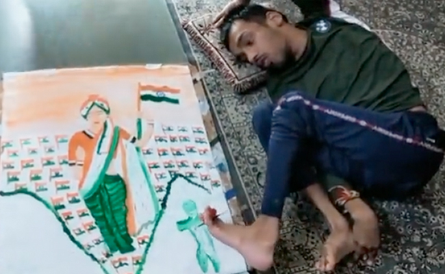 देश भर में लोगों ने अपने-अपने अंदाज में स्वतंत्रता दिवस का अमृत महोत्सव मनाया है. आजादी के 75 साल पूरे होने की खुशी में लोगों ने तिरंगा फहराकर इस जश्न को मनाया. वहीं एक कलाकार का वीडियो सामने आया है, जिसने हर घर तिरंगा अभियान को अपनी बनाई पेंटिंग में बखूबी दिखाने की कोशिश की है. इस कलाकार की बनाई ये तस्वीर बेहद खूबसूरत नजर आ रही है. तस्वीर के साथ ही इस कलाकार में भी कुछ खासियत है, ये पेंटिंग हाथ से नहीं, बल्कि पैर से बनाई गई है.