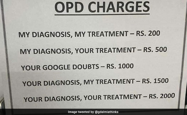 वायरल हो रहे ओपीडी चार्जेस में 5 अलग-अलग चार्ज लिखे हैं, जिसमें पहली फीस यह है कि अगर डॉक्टर ही आपकी जांच करें और फिर इलाज करें, तो उसकी फीस होगी 200 रुपये. अगर डॉक्टर से जांच के बाद उन्हें अपना बताया इलाज करने पर मजबूर किया, तो फीस 500 रुपये होगी. इस बीच गूगल से बीमारी के बारे में पढ़कर अगर सवाल-जवाब किए, तो उसकी फीस अलग से होगी, जो सीधे 1 हजार रुपये होगी. इसके आगे की फीस और मजेदार है. अगर मरीज ने नेट से पढ़कर अपनी बीमारी के बारे में ज्ञान बघारा और फिर इलाज लिया, तो फीस 1500 रुपये होगी और अगर ऐसा मरीज पहुंच जाए, जो बीमारी भी खुद ही बता दे, इलाज भी खुद ही कर ले, फिर डॉक्टर की शरण में आए तो फीस 2 हजार रुपये होगी. इस दिलचस्प फीस चार्ट को शेयर किया गया है गौरव डालमिया नाम के ट्विटर हैंडल से.