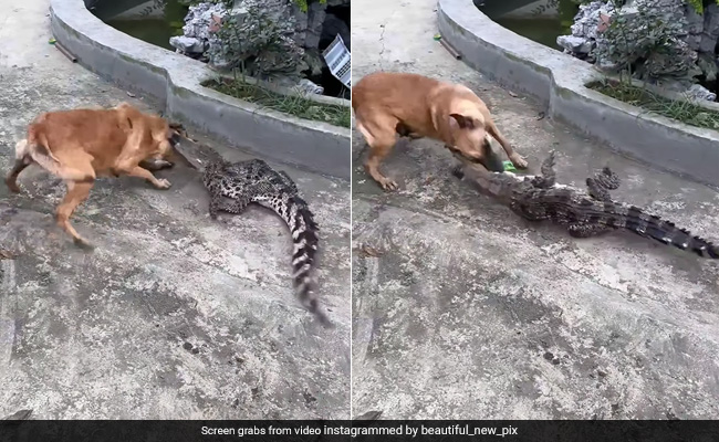 वायरल हो रहे इस वीडियो में आप देख सकते हैं कि कुत्ता, मगरमच्छ को छेड़ रहा है और अचानक उसपर हमला कर देता है. कुत्ता मगरमच्छ के जबड़े को किनारे की तरफ से अपने मुंह में दबाता है और उसे नोंचने लगता है. मगरमच्छ खुद को बचाने की कोशिश करता है, लेकिन उसकी कोशिश नाकाम होती है. फिर कुत्ता, मगरमच्छ को मुंह से दबाकर खींचने लगता है. और कुछ दूर तक घसीट लेता है.