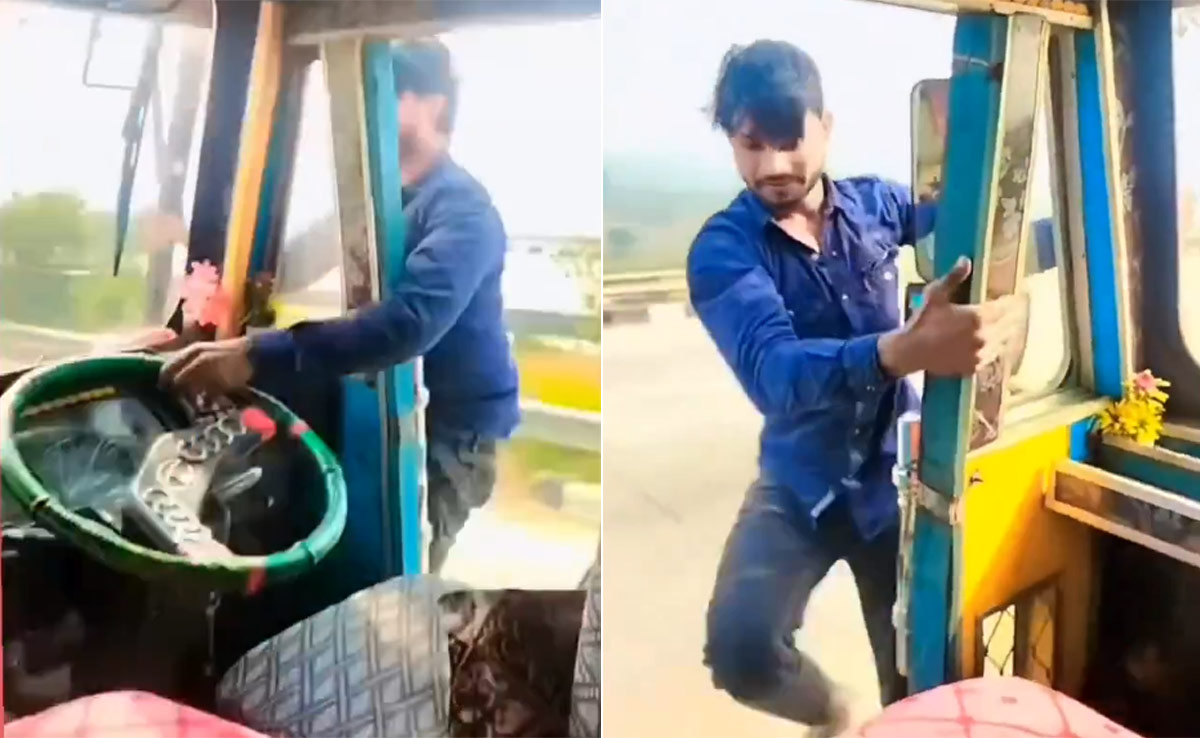 एक्स पर शेयर हुए इस वीडियो में ट्रक ड्राइवर सबसे पहले चलते ट्रक के स्टीयरिंग को लावारिस छोड़ कर ट्रक का दरवाजा खोल देता है और फिर बाहर की ओर निकल जाता है. फुल स्पीड में चल रहे ट्रक पर वह अपना बैलेंस बनाता है और ट्रक पर चलते हुए सामने से गुजर जाता है और फिर घूम कर दूसरे दरवाजे से आकर फिर से सीट पर बैठ जाता है और स्टीयरिंग को दोबारा हाथ में थाम लेता है.