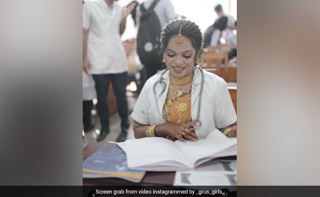 वायरल हो रहे इस वीडियो में दिख रही केरल की रहने वाली यह दुल्हन शादी के जोड़े के ऊपर स्टेथोस्कोप लटकाए और प्रैक्टिकल लैब कोट पहनी नजर आ रही है. वीडियो की शुरुआत दुल्हन की दोस्त उसके कार से उतरते ही उसकी साड़ी का पल्लू सही करती नजर आती है. वीडियो में पीले रंग की साड़ी पर भारी आभूषण पहनी यह दुल्हन लैब कोट के ऊपर गले में स्टेथोस्कोप लटकाए परीक्षा हॉल में प्रवेश करती नजर आ रही है. परीक्षा हॉल में प्रवेश करते ही दुल्हन अपने दोनों हाथों को हिलाते हुए क्लास के अन्य लोगों से खुशी-खुशी मिलती नजर आ रही है. परीक्षा के बाद दुल्हन बाहर एग्जाम हॉल से बाहर आते ही अपनी मां को गले से लगा लेती है.