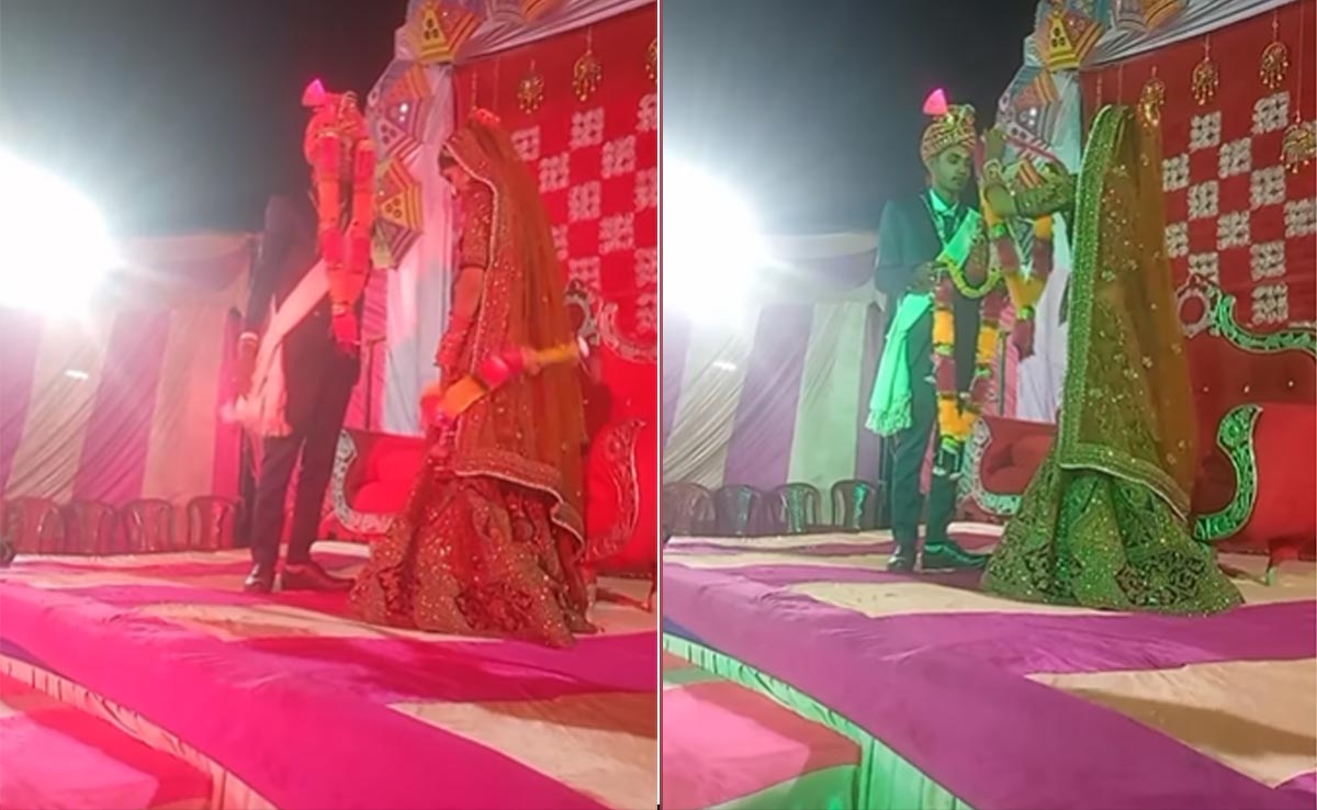 इंस्टाग्राम पर शेयर हुए इस वीडियो में शादी के दौरान दूल्हा और दुल्हन स्टेज पर जयमाला थामे खड़े हैं. पहले दुल्हन की जयमाला डालने की बारी है. हाथों में लाल-पीली जयमाला लिए दुल्हन बेमन से हार को दूल्हे की ओर उछाल देती है. जयमाला जाकर दूल्हे के सहरे में फंस जाती है और उसका चेहरा ही ढक जाता है. अपने साथ ऐसी हरकत को देख ये दूल्हा भी गुस्से से जयमाला दुल्हन की ओर फेंकता है, जो दुल्हन की गले में जाने की जगह नीचे जाकर गिरती है.