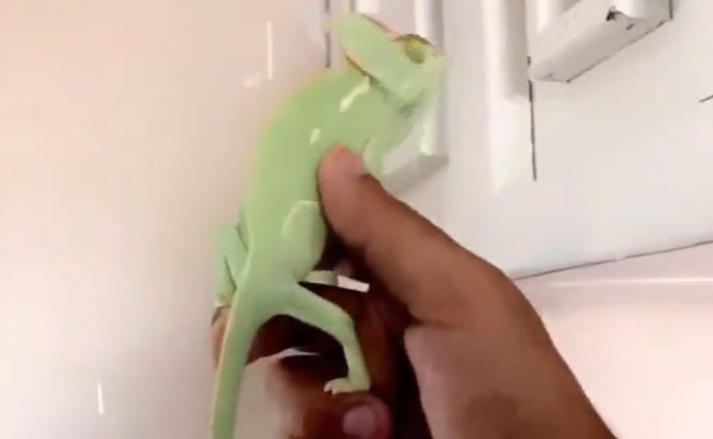 ट्विटर पर सामने आए वीडियो में देखा जा सकता है कि एक शख्स ने अपनी उंगलियों से हरे रंग की एक मोटी सी छिपकली को पकड़ रखा है. वह छिपकली को किचन सेल्फ के पास ले जाता है और छिपकली एक-एक कर अपनी जीभ में लपेट कर कीड़ों को चट कर जाती है. जहां भी कीड़े दिखाई देते है शख्स छिपकली को वहीं ले जाता है और वह अपनी भूख मिटाती नजर आती है. वीडियो को इस तरह एडिट किया गया है कि छिपकली जैसे ही अपने शिकार की ओर लपकती है, वैसे ही बुलेट की आवाज आती है, ऐसा लगता है छिपकली कीड़ों पर फायर कर रही है.