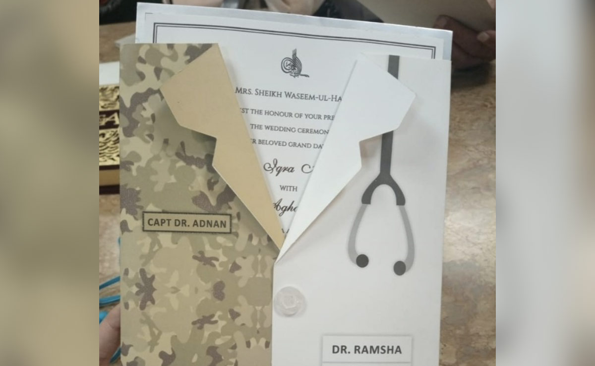 ये कार्ड X पर यूजर @Shaiibi0 ने 20 जनवरी को शेयर किया था. खबर लिखे जाने तक इस कार्ड को 622.4K व्यूज मिल चुके थे. वहीं 1800 से ज्यादा लाइक्स मिले हैं. कार्ड को एक शर्ट का रूप दिया गया है, जिसमें बकायदा बटन लगा दिख रहा है. शर्ट नुमा कार्ड को दो भागों में बांट दिया गया है, आधा आर्मी ड्रेस और आधा डॉक्टर. आर्मी की साइड फौजी का नाम लिखा दिखाई दे रहा है, कैप्टन डॉक्टर अदनान. वहीं दूसरी तरफ डॉक्टर डिजाइन वाली साइड लिखा है डॉक्टर रमशा. देखने में कार्ड बहुत सुंदर है और इससे भी ज्यादा लोगों को इसका कॉन्सेप्ट भा रहा है.