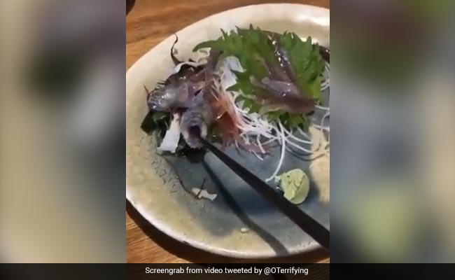 ट्विटर पर वीडियो के साथ कैप्शन में लिखा है, "रेस्तरां में परोसी गई मछली चॉपस्टिक को काट लेती है." वीडियो में दिखाया गया है कि एक जापानी रेस्तरां में एक ग्राहक को कच्ची मछली और सलाद सर्व किया गया है. हालांकि, कुछ असामान्य हुआ जब ग्राहक ने अपना खाना खाने के लिए अपनी चॉपस्टिक का इस्तेमाल किया. मछली ने अपना मुँह खोला और चॉपस्टिक को पकड़ लिया. और जब ग्राहक ने उसे वापस खींचने की कोशिश की तो मछली छोड़ ही नहीं रही थी. वीडियो को मूल रूप से फरवरी 2022 में इंस्टाग्राम यूजर ताकाहिरो द्वारा पोस्ट किया गया था.