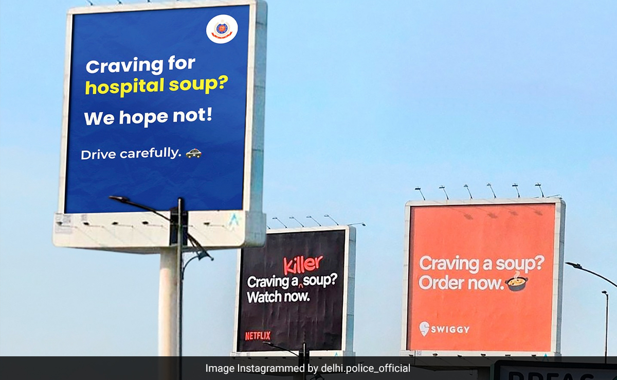 पहला होर्डिंग एक स्विगी ऐड का है, जो ड्राइवरों को अपनी क्रेविंग को पूरा करने के लिए सूप का एक बाउल ऑर्डर करने को कहता है. इसके बाद दूसरी होर्डिंग भी एक ऐड है, जिसमें 'किलर सूप' नाम की नेटफ्लिक्स सीरीज देखने की अपील है. इसके ठीक सामने दिल्ली पुलिस ने अपनी होर्डिंग लगाई है, जिस पर लिखा है, हॉस्पिटल सूप के लिए क्रेविंग हो रही है, उम्मीद है ऐसा नहीं है. तो सेफली ड्राइव करें.