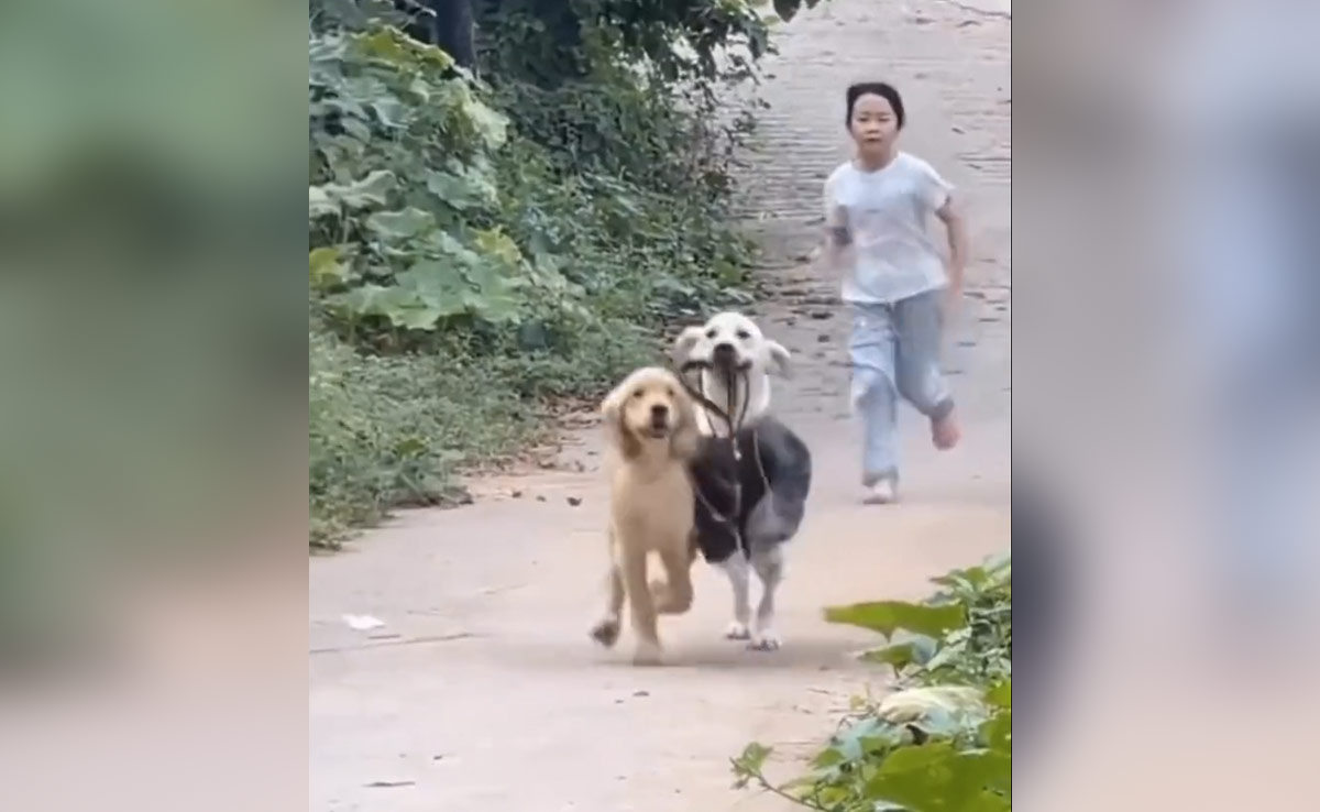 Epoch Animal Lovers नाम के अकाउंट से एक्स पर शेयर हुए इस वीडियो में एक बच्ची अपने कुत्ते को लिए टहलाने जा रही होती है. भूरे रंग के इस डॉगी के गले में पट्टा बंधा नजर आता है, जिसकी डोर लड़की के हाथ में होती है. लड़की अपने डॉगी के साथ आराम से जा रही होती है, तभी पीछे से दौड़ता हुआ सफेद रंग का दूसरा डॉगी वहां पहुंच जाता है और लड़की से भिड़ जाता है. वह लड़की के हाथ के उसके डॉगी के पट्टे की बेल्ट लेकर अपने जबड़ों में दबा लेता है और फिर अपने दोस्त को आजाद करा कर भाग निकलता है.