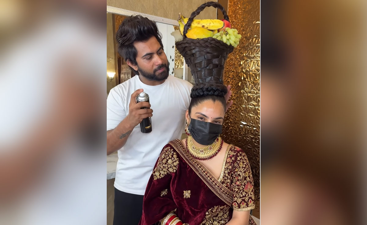 इस दुल्हन का जूड़ा देखकर आपके होश उड़ जाएंगे. हालांकि, ये सच में दुल्हन है या कोई मॉडल ये साफ नहीं है. दुल्हन के जोड़े में सजी महिला के सिर पर हेयर स्टाइलिस्ट बालों से फलों की टोकरी बनाता दिखाई देता है. बाल से ही वो उस टोकरी में एक हैंडल भी लगा देता है. इसके बाद एक-एक कर वह टोकरी में फलों को सजा देता है. वह पहले आम, फिर अंगूर और सेब वगैरह रखता है. इतना ही नहीं हेयर स्टाइलिस्ट खुद की बनाई इस टोकरी से फल निकाल कर खाने भी लगता है.