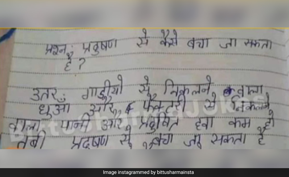 वायरल हो रही आंसर शीट (Answer Sheet) में जो सवाल लिखा है, उसमें पूछा गया है कि प्रदूषण से कैसे बचा जा सकता है? जिसके उत्तर में स्टूडेंट लिखा है- गाड़ियों से निकलने वाला धुआं और फैक्ट्री से निकलने वाला पानी और प्रदूषित हवा कम हो जाए तभी प्रदूषण से बचा जा सकता है... बच्चे ने इसके आगे जो लिखा वो पढ़कर तो आप अपनी हंसी को रोक ही नहीं पाएंगे. बच्चे से आंसर में आगे लिखा- बहुत प्यार करते हैं तुमके सनम, कसम चाहे ले लो खुदा की कसम, हमें हर घड़ी आरजू है तुम्हारी, होती है कैसी सनम बेकरारी, मिलेंगे जो तुमको तो बताएंगे हम, अगर ये सब सावधानियों बरतेंगे तभी प्रदूषण से बचा जा सकता है.
