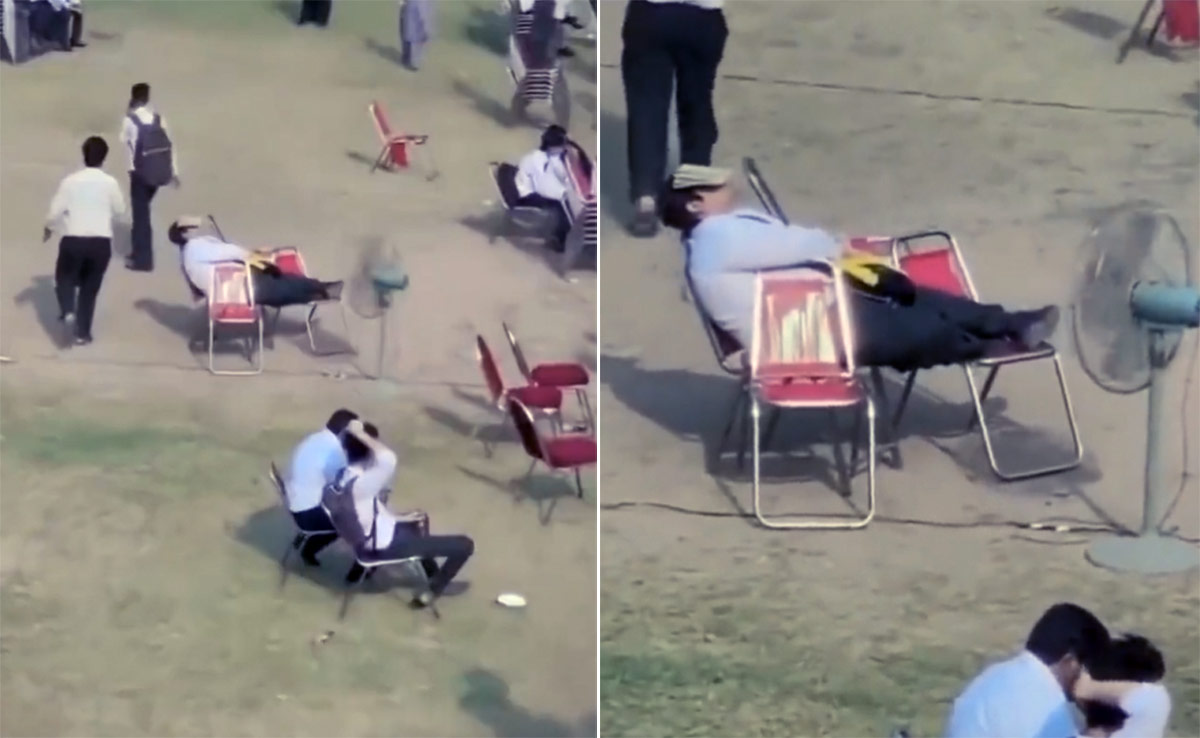 वीडियो में आप देख सकते हैं कि, एक नेताजी का भाषण चल रहा है, लाउडस्पीकर का शोर, आस-पास भागते लोग, तेज गर्मी में गर्म आवाज फेंकता पंखा और ऊपर से गर्मी से लाल-पीले होते सूरज महाराज, ऐसी दुर्गम सिचुएशन में स्कूल का ये स्टूडेंट दो तीन कुर्सियों को पलंग बनाकर सोया पड़ा है. उसने धूप से बचने के लिए मुंह के ऊपर किताब रखी है और आराम फर्माने के लिए कुर्सियों पर पैर रख हुए हैं. आस-पास का माहौल देखकर किसी भी इंसान को इस स्थिति में नींद क्या चैन तक नहीं आ सकता है. सलाम है नींद के इस मोटे ताजे सिपाही को, जो सारे घोड़े बेचकर सो रहा है.