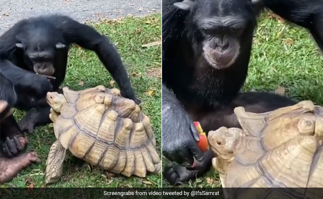 बचपन में आपने खरगोश-कछुए की दौड़ और दोस्ती की कहानी ज़रूर सुनी होगी, जिसमें तेज़ दौड़ने वाले खरगोश से कछुआ जीत जाता है, लेकिन शायद ही आपने चिम्पांजी और कछुए की दोस्ती की कोई कहानी सुनी होगी. आज हम आपको ऐसी ही एक दोस्ती का वीडियो दिखाने जा रहे है, जिसमें दोनों की दोस्ती देखकर आपका दिन बन जाएगा.