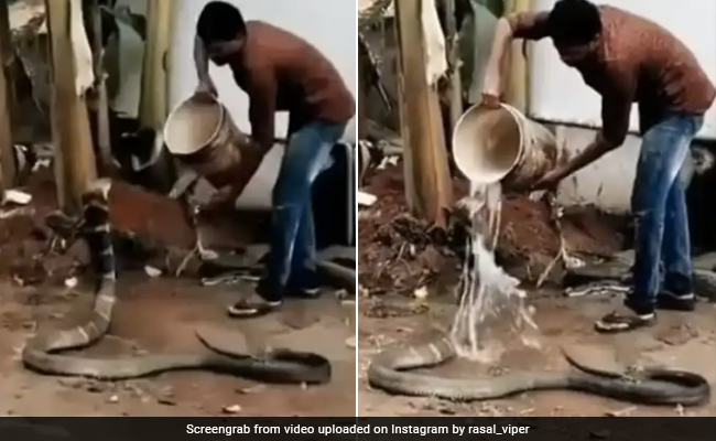 सांप का नाम सुनते ही कई लोगों के होश उड़ जाते हैं. ऐसे में आपके सामने साक्षात किंग कोबरा आ जाए तो उस डर का अंदाजा लगाना पाना काफी मुश्किल है, लेकिन इन दिनों सोशल मीडिया पर वायरल एक वीडियो में इसके उल्ट एक अलग ही नजारा देखने को मिल रहा है. वीडियो में एक विशालकाय किंग कोबरा नजर आ रहा है, जिस पर एक शख्स बिना डरे बाल्टी से पानी डाल रहा है. वायरल होते इस वीडियो को देखकर यूजर्स की भी आंखें फटी की फटी रह गई.